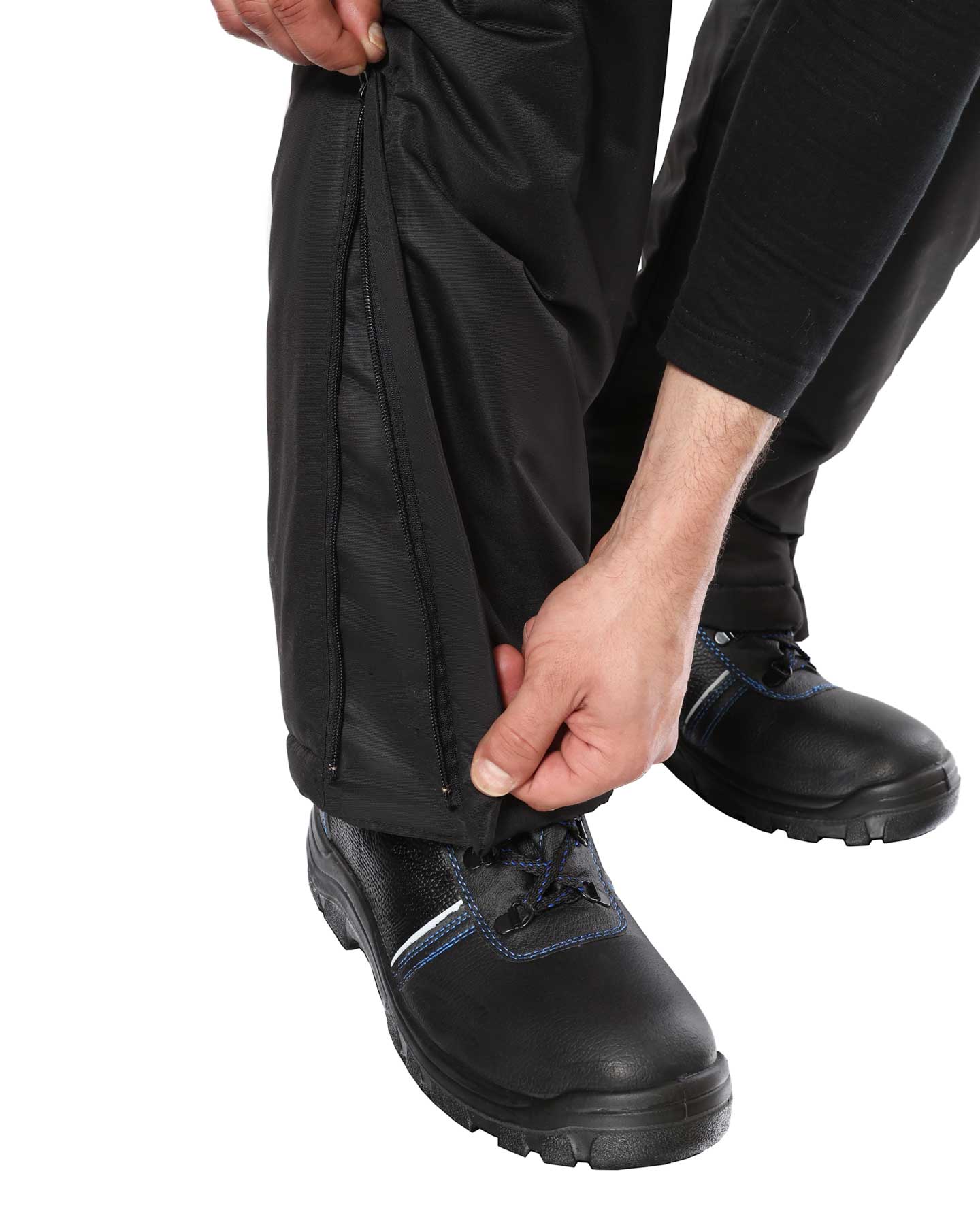 Брюки прямые на утеплённой подкладке, с застежкой спереди на молнию – гульфик. Брюки с широким поясом с застежкой на 2 пуговицы, с боковыми накладными карманами с молнией, со съёмными бретелями. Бретели пристегиваются к брюкам при помощи пуговиц и петель, регулируются по длине защелками-фастексами. По боковым швам внизу разрез с молнией. В брюках на задних половинках предусмотрен кант СВМ 3мм 100К для обозначения сигнальной видимости.
