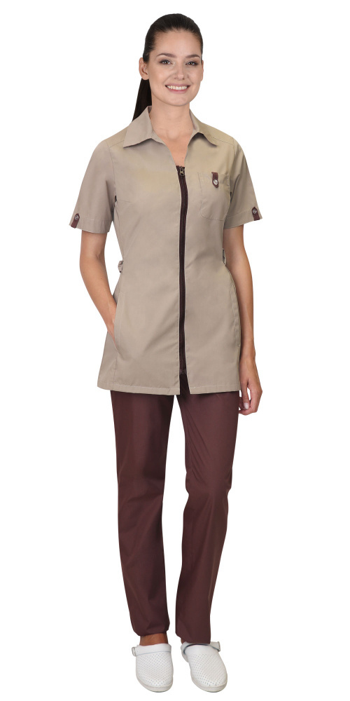 Блуза полуприлегающего силуэта с центральной застёжкой на молнию, с завязывающимся сзади поясом. Воротник отложной. Два боковых кармана в рельефных швах. Один нагрудный накладной фигурный карман. Рукава втачные короткие. На нагрудном кармане и рукавах паты из отделочной ткани. Брюки прямые на притачном поясе, частично стянутом на эластичную тесьму, спереди на поясе вставка.