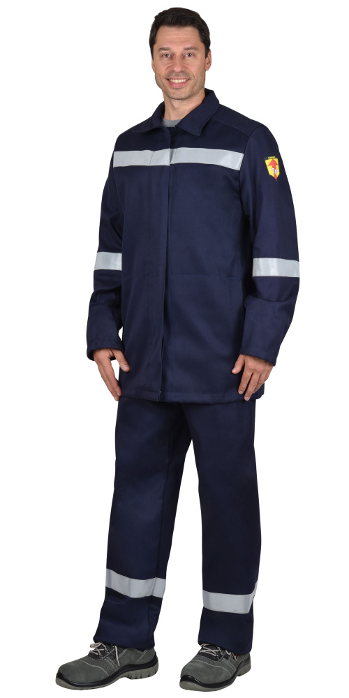 Костюм из огнеупорной ткани, состоит из куртки и брюк, на куртке и брюках предусмотрена огнеупорная светоотражающая лента шириной 50мм для обозначения сигнальной видимости.