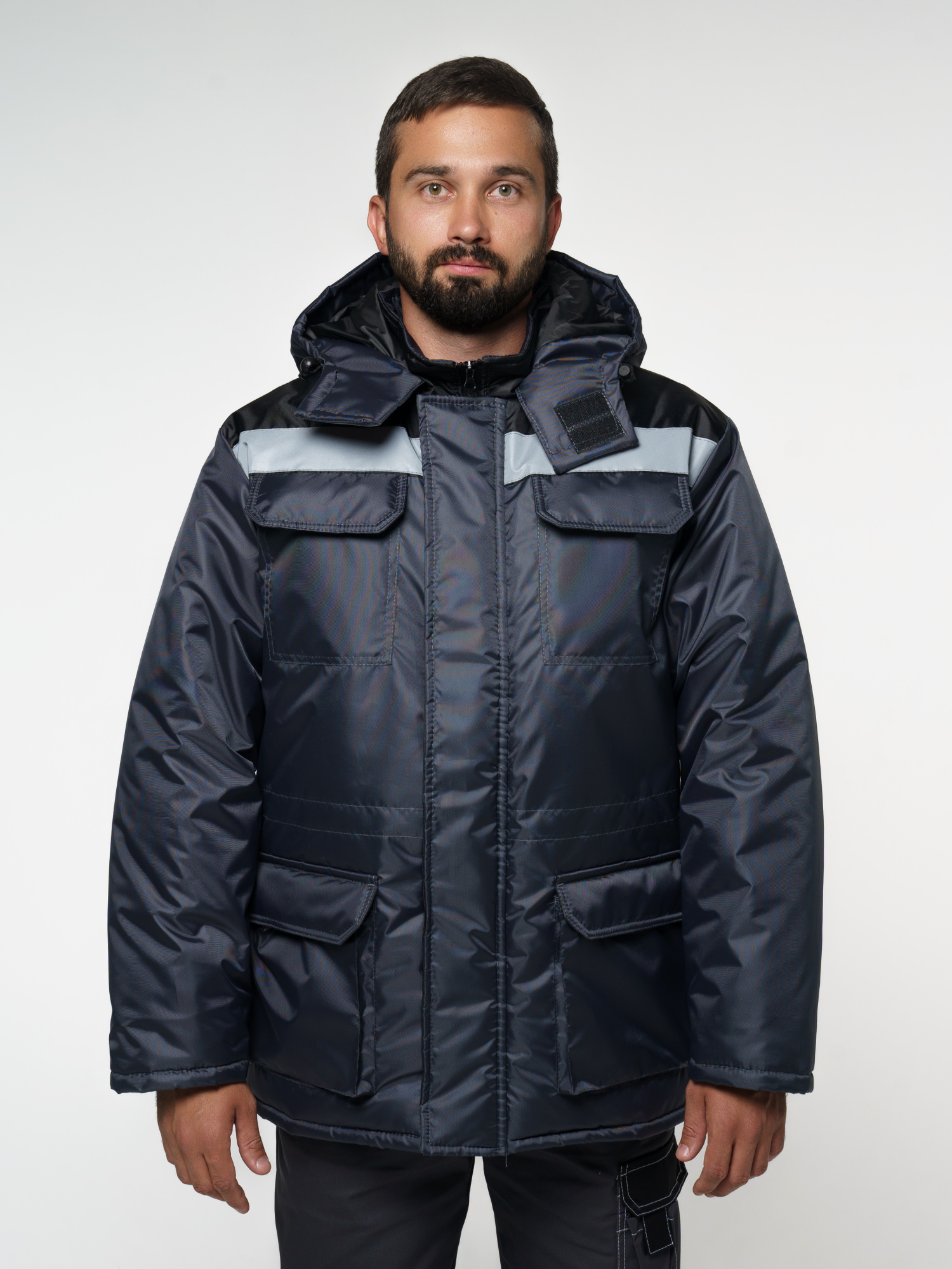 Куртка прямого силуэта, с центральной застежкой на молнию с ветрозащитной планкой на липучках. Нагрудные накладные карманы и нижние объемные накладные карманы-портфель с клапаном на липучках. Кокетки полочек и спинки выделены СВ кантом. В рукавах трикотажные манжеты-напульсники. По линии талии кулиса со шнуром-резинкой и фиксатором. Воротник-стойка. Съемный утепленный капюшон на пуговицах, по лицевому вырезу кулиса со шнуром-резинкой и фиксаторами, по лицевой части застегивается на липучки. Подкладка простегана с утеплителем, внутренний накладной карман на левой полочке. Ткань Оксфорд (100% п/э).