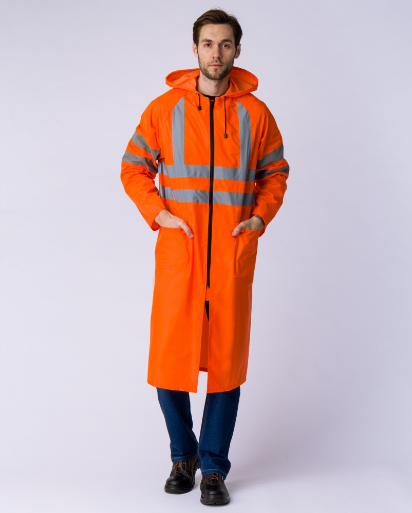 Плащ изготовлен из прочной плащевой ткани с ПВХ покрытием.