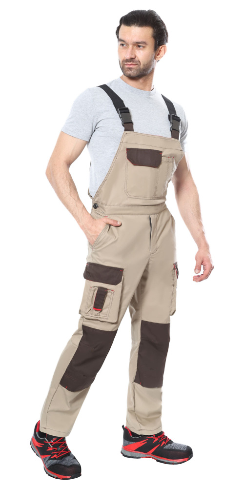 Полукомбинезон с застежкой спереди на гульфик с молнией и с застежкой в правом боковом шве на пуговицу, с наколенниками, с бретелями. Полукомбинезон спереди и сзади с накладными карманами. Спереди с нагрудным карманом с клапаном, на липучке. Сзади полукомбинезон по талии стянут резинкой для лучшего прилегания по фигуре. Бретели выполнены из резинки, длина бретелей регулируется при помощи защелки-фастекса.
