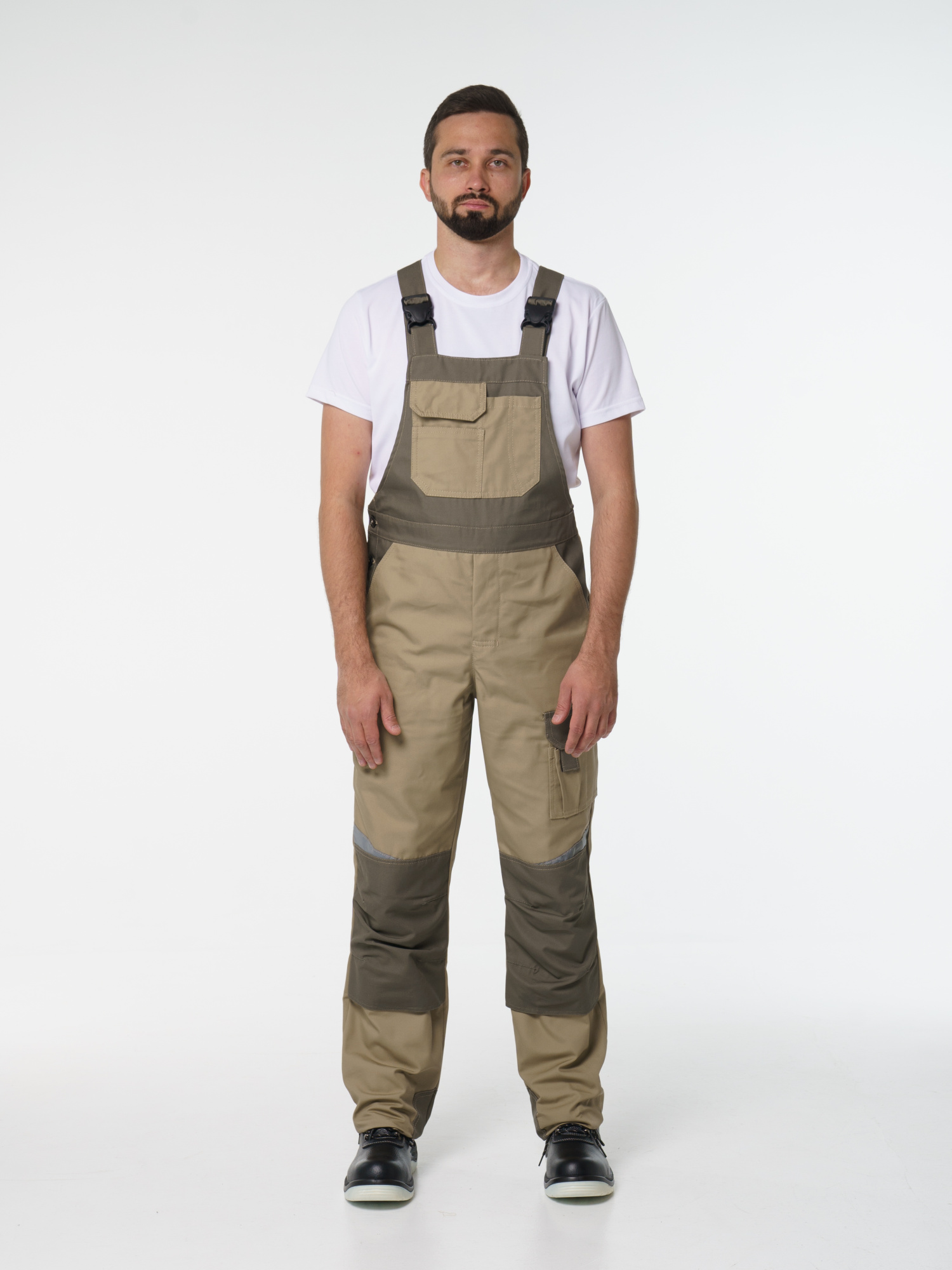 Полукомбинезон с застёжкой гульфика на молнию и застёжкой в боковом шве на пуговицы; с различными многофункциональными карманами; с объемными наколенниками. В полукомбинезоне предусмотрена лента светоотражающая (мелкодисперсная белая) фигурной формы.